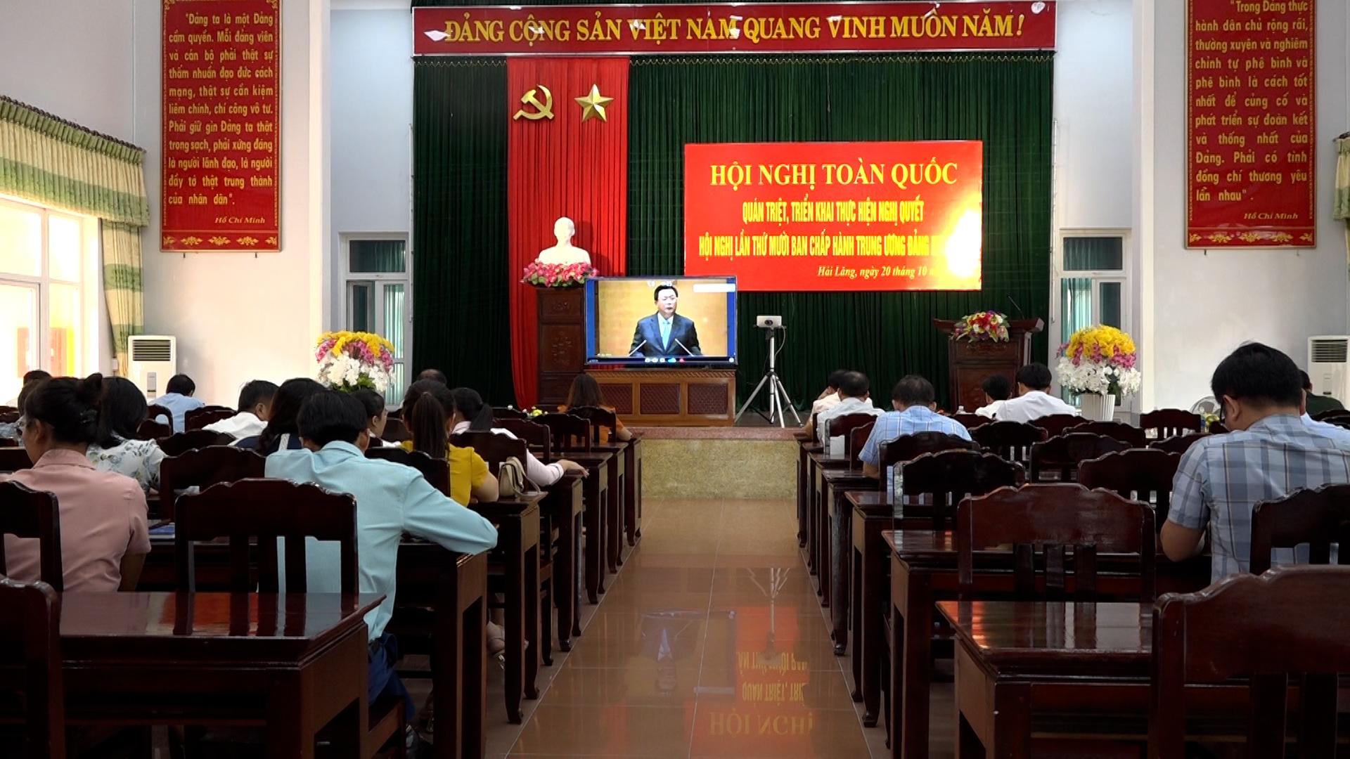 Sáng 20/10, Bộ Chính trị, Ban Bí thư tổ chức Hội nghị toàn quốc quán triệt, triển khai thực hiện Nghị quyết Hội nghị lần thứ 10, Ban Chấp hành Trung ương Đảng khóa XIII. Hội nghị được tổ chức bằng hình thức trực tiếp từ điểm cầu Trung ương ở Hội trường Diên Hồng, Nhà Quốc hội; kết hợp trực tuyến đến gần 15.000 điểm cầu với hơn 1,2 triệu người tham dự. Tổng Bí thư, Chủ tịch nước Tô Lâm dự và chỉ đạo Hội nghị tại điểm cầu Trung ương. Huyện Hải Lăng đã tiếp sóng trực tuyến hội nghị này ở điểm cầu trung tâm huyện và các xã, thị trấn.