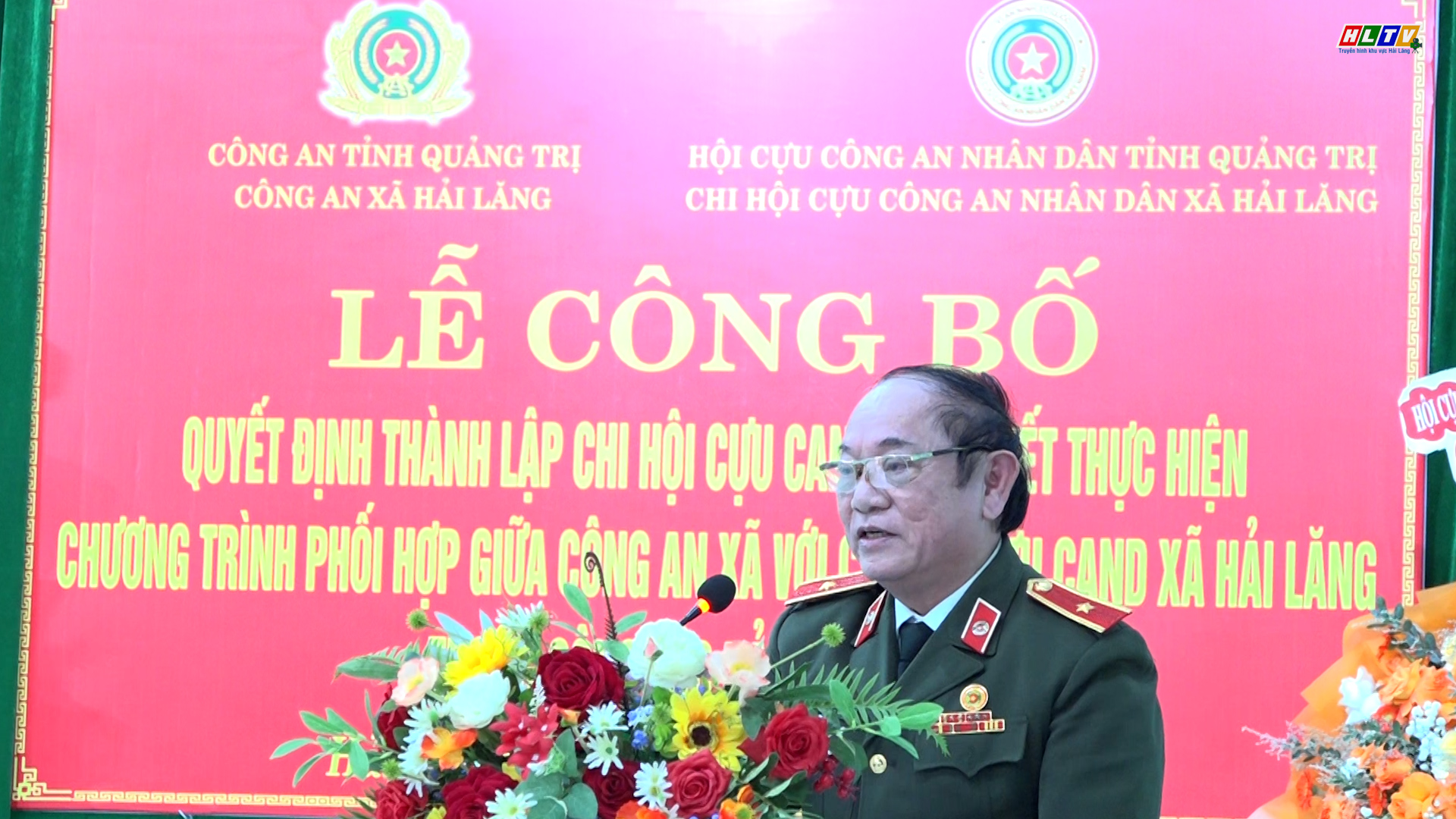 Đồng chí Thiếu tướng Lê Công Dung trao quyết định, tặng hoa chúc mừng Chi hội Cựu CAND xã Hải Lăng