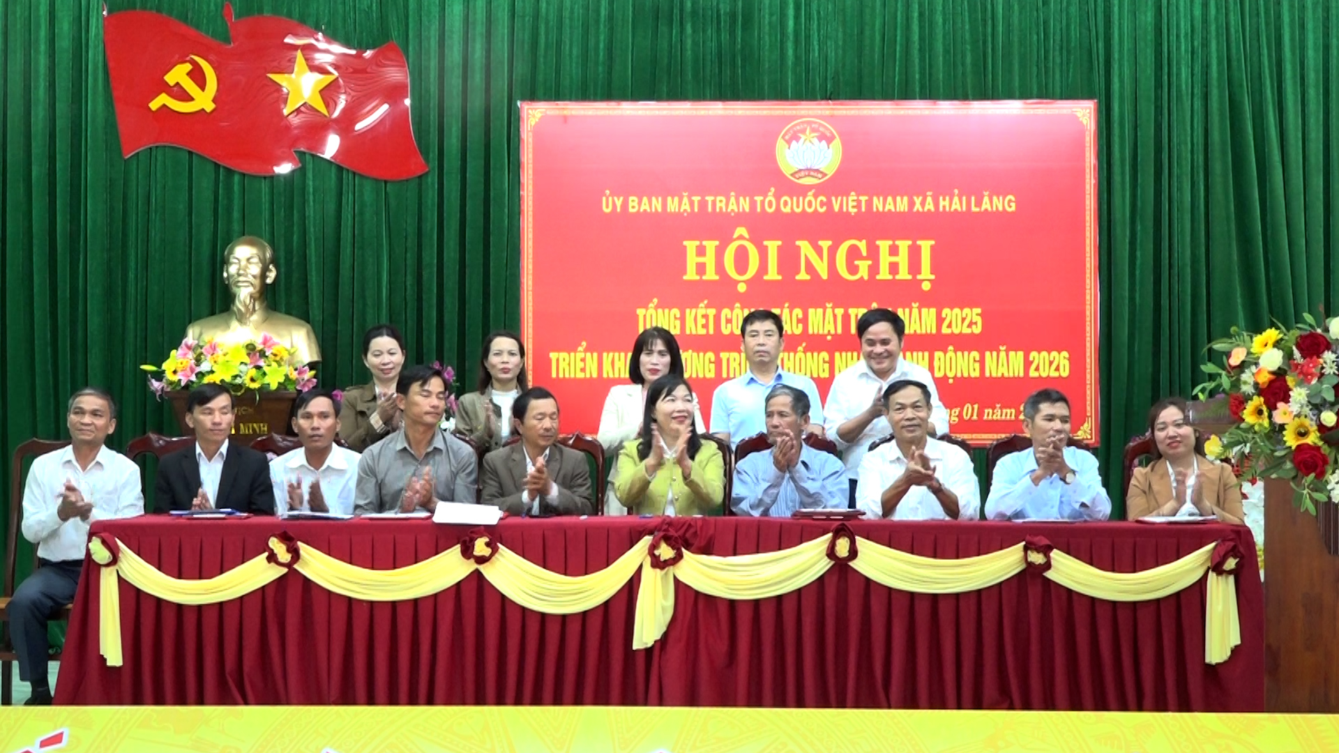 Tại hội nghị, Uỷ ban MTTQ Việt Nam xã Hải Lăng tổ chức ký cam kết thi đua thực hiện nhiệm vụ năm 2026 giữa Ban Thường trực Uỷ ban MTTQ xã các tổ chức thành viên, Ban Công tác Mặt trận các thôn, thể hiện quyết tâm chính trị, tinh thần đoàn kết, chủ động, sáng tạo trong tổ chức thực hiện các phong trào thi đua yêu nước và các cuộc vận động.