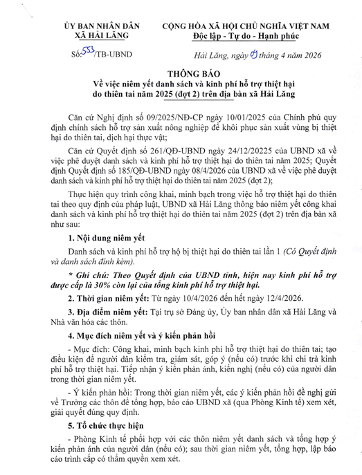 UBND xã Hải Lăng thông báo niêm yết danh sách và kinh phí hỗ trợ thiệt hại do thiên tai năm 2025 (đợt 2) trên địa bàn xã Hải Lăng như sau:
