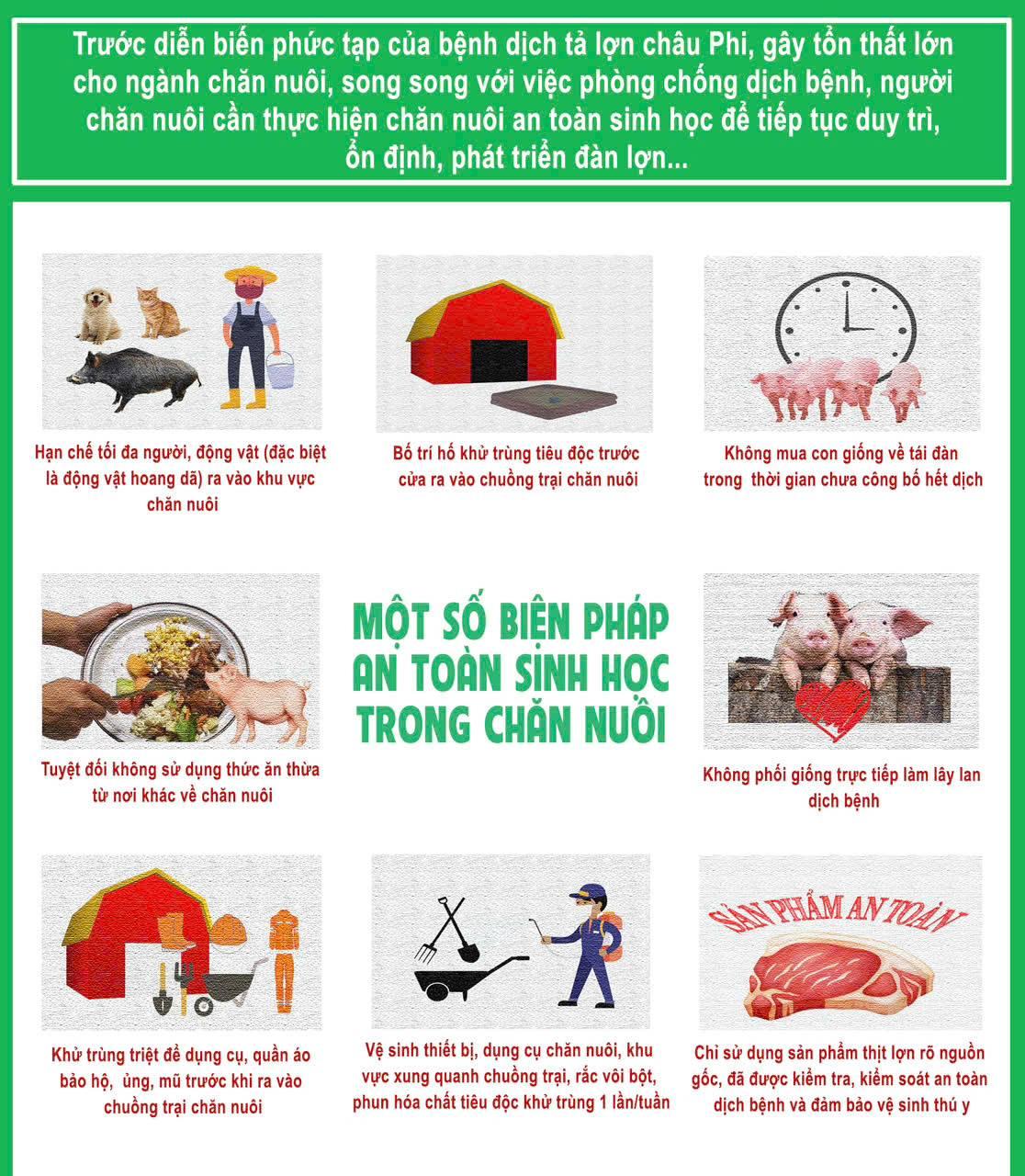 Trước tình hình này, UBND tỉnh yêu cầu các sở, ngành và các địa phương tập trung chỉ đạo quyết liệt công tác phòng, chống dịch; không được chủ quan, lơ là. Các địa phương cần đẩy mạnh tuyên truyền để người chăn nuôi nắm rõ mức độ nguy hiểm của dịch bệnh, chủ động áp dụng các biện pháp chăn nuôi an toàn sinh học, thường xuyên vệ sinh, tiêu độc khử trùng chuồng trại.