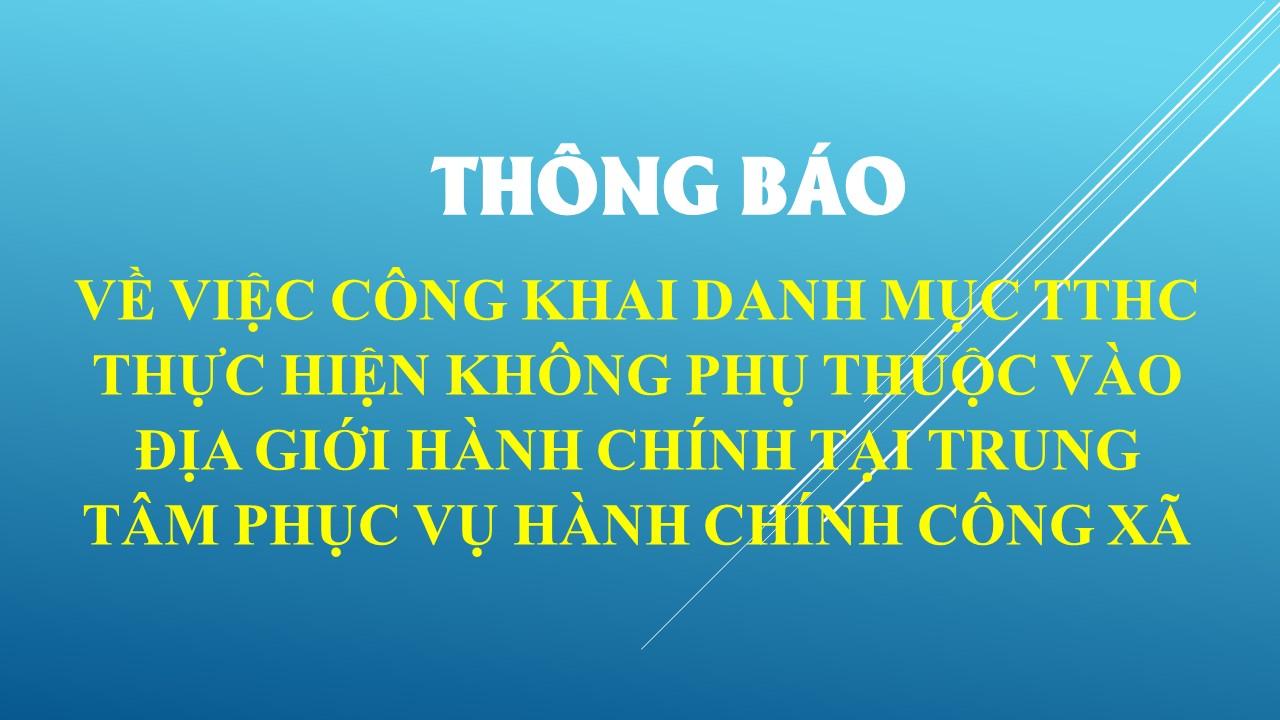 Thông báo về việc công khai danh mục TTHC thực hiện không phụ thuộc vào địa giới hành chính tại Trung tâm Phục vụ hành chính công xã