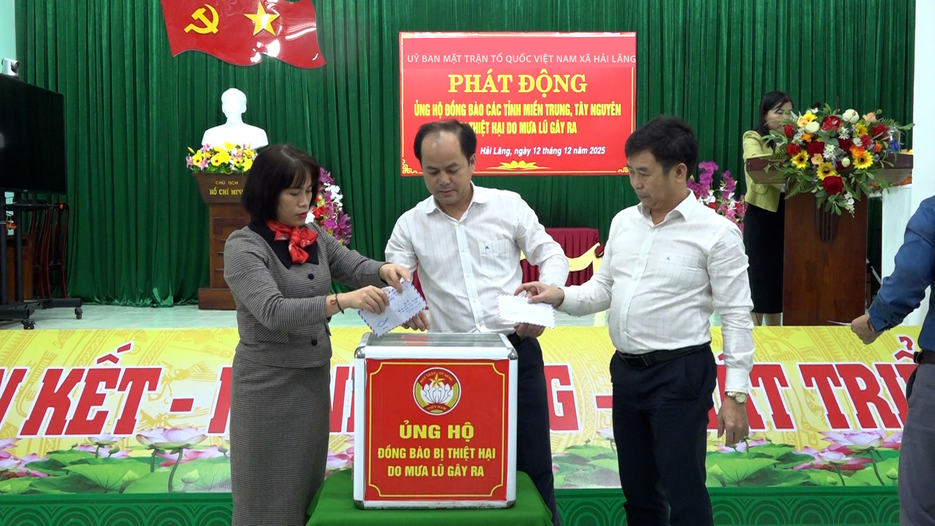 Hưởng ứng Lời kêu gọi của Đoàn Chủ tịch Uỷ ban Trung ương Mặt trận Tổ quốc Việt Nam, Uỷ ban Mặt trận Tổ quốc Việt Nam tỉnh, từ ngày 27/11 đến 15/12/2025, Ủy ban MTTQ Việt Nam xã Hải Lăng đã phát động hưởng ứng đợt vận động “Nghĩa tình Hải Lăng hướng đến đồng bào miền Trung, Tây Nguyên” và kêu gọi toàn thể cán bộ, đảng viên, hội viên, Nhân dân, các tổ chức, doanh nghiệp trên địa bàn phát huy tinh thần đoàn kết, nghĩa tình, cùng chia sẽ với đồng bào vũng lũ. Với tinh thần đoàn kết, tương thân tương ái, thời gian qua, các khu dân cư, các cơ quan, đơn vị cùng nhiều tập thể, cá nhân trên địa bàn xã đã tích cực vận động ủng hộ đồng bào miền Trung, Tây Nguyên bị thiệt hại do mưa lũ.