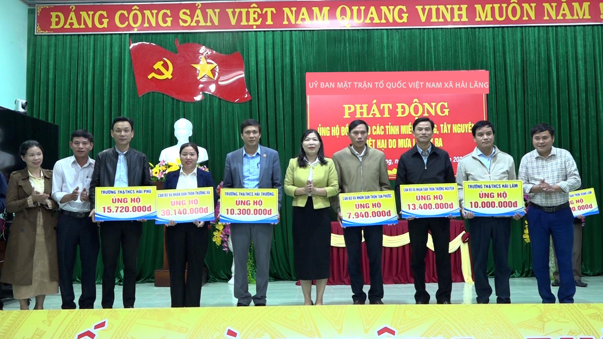 Tại buổi tiếp nhận, các tập thể, cá nhân đã trao ủng hộ đồng bào vùng lũ miền Trung, Tây Nguyên khắc phục hậu quả mưa lũ, trong đó cán bộ và nhân dân thôn Thượng Xá ủng hộ gần 36 triệu đồng, cán bộ và nhân dân thôn Long Hưng ủng hộ 30 triệu đồng. Các chị Cồ Thị Mỹ Hoa, Võ Thị Diệu Loan, Lê Thị Liên ủng hộ 1 tấn gạo. Đến thời điểm này, tổng số tiền ủng hộ được gửi về Uỷ ban MTTQ Việt Nam xã Hải Lăng là …. triệu đồng.