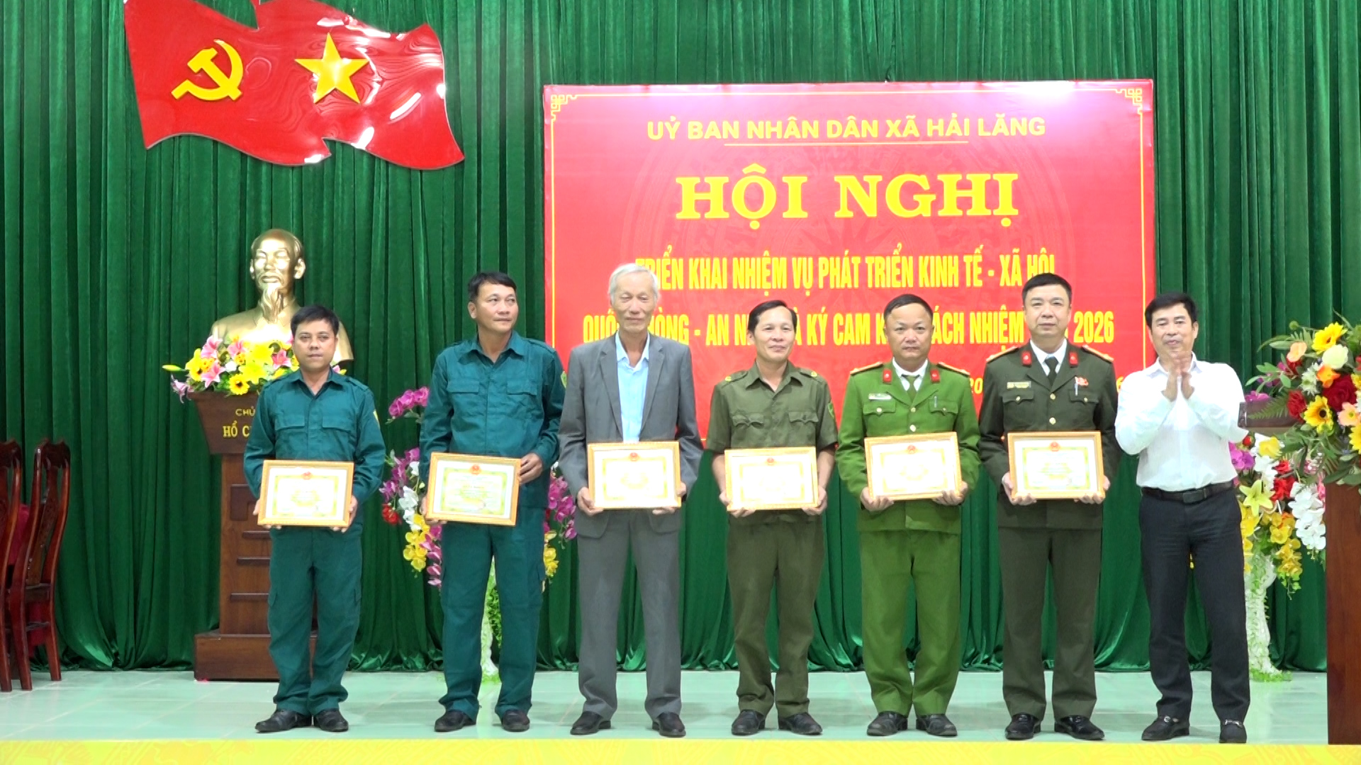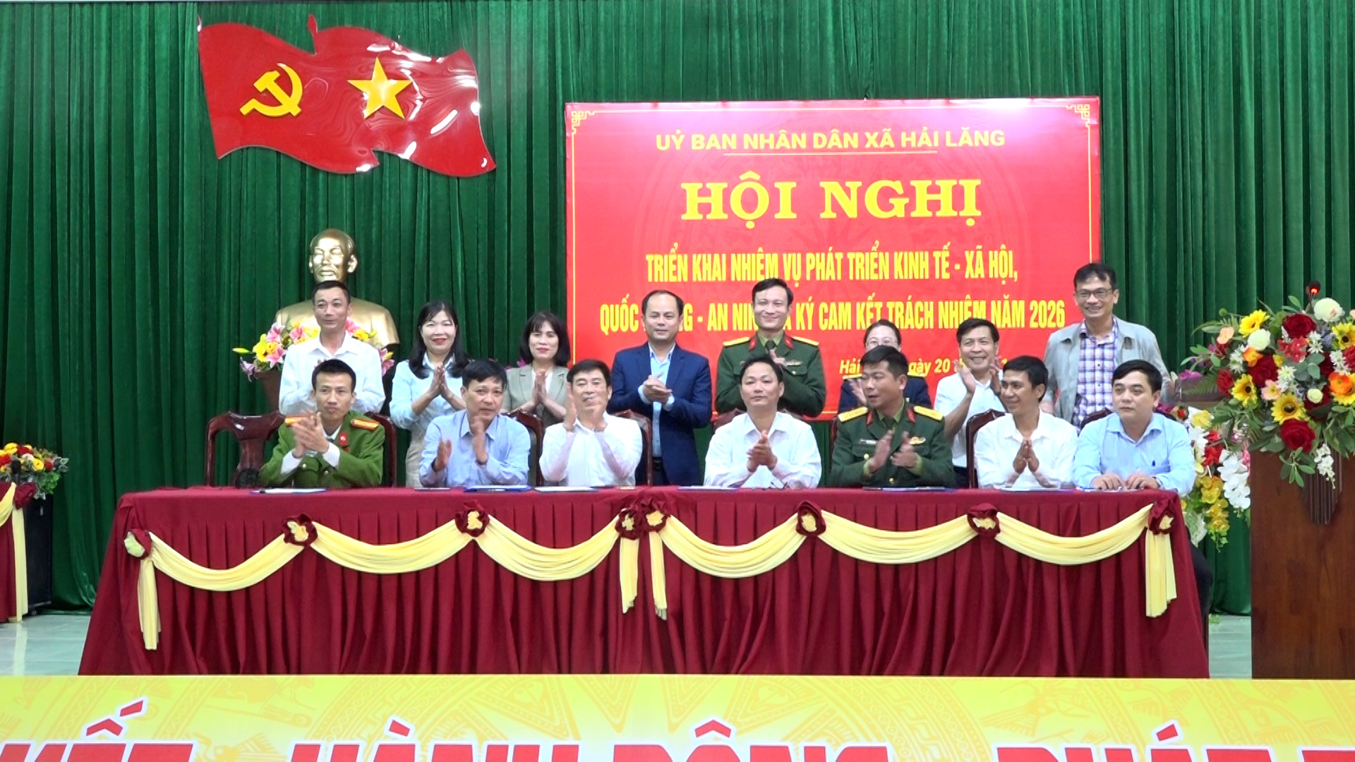 Hội nghị đã tổ chức ký cam kết trách nhiệm người đứng đầu các cơ quan, đơn vị với Chủ tịch UBND xã năm 2026. Đồng thời, UBND xã Hải Lăng khen thưởng cho 6 tập thể và 9 cá nhân có thành tích xuất sắc trong lĩnh vực quốc phòng – an ninh năm 2025.